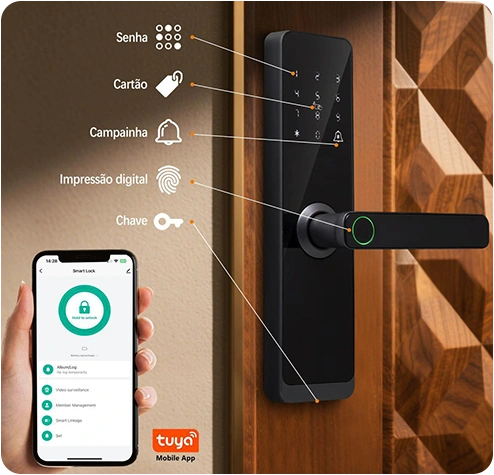 Tuya Smart. Nele você gerencia membros/biometrias, cria senhas, acompanha log de aberturas, integra a automações (“Smart Linkage”) e recebe recursos de controle/monitoramento compatíveis com o ecossistema Tuya.